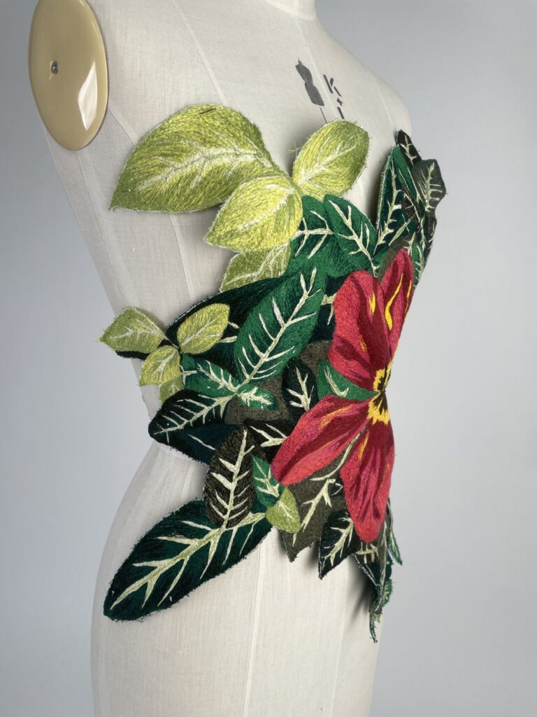 Biotic celebrates the delicate beauty and structural complexity of the natural world, specifically focusing on leaves and flowers. I drew inspiration from the concept of being ‘Stitched through Nature’ as my body of work explores the organic relationship between textiles and the environment, blending embroidery and natural forms in a way that feels personal and meaningful. I was influenced by visits to Kew Gardens, the Barbican Conservatory and exhibitions at the Saatchi Gallery. Biotic combines high fashion sensibility with a deep respect for nature and artistry. The Project is designed for a luxury market, targeting an audience with an appreciation for one-of-a-kind, hand-crafted embroidery.