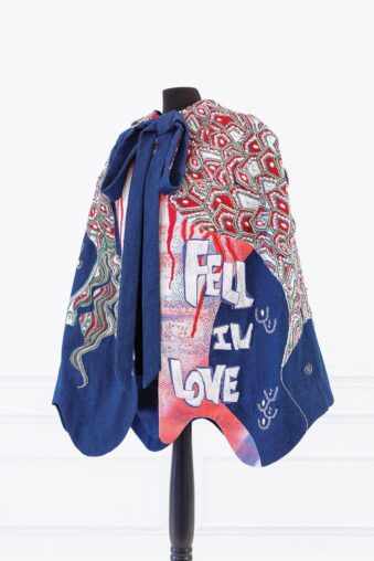 The mythical and mysterious love story “The Mermaid of Zennor” has been Madelaine-Rose’s inspiration for her final piece. The story follows an unconventional romance between a man with perfect pitch and a beautiful stranger who is secretly a mermaid. Madelaine-Rose reimagines the tale in unexpected ways, using processes of graffiti, hand embroidery, and tin can embellishments to give the legend a contemporary twist.