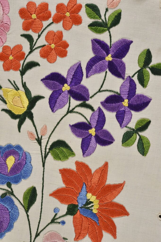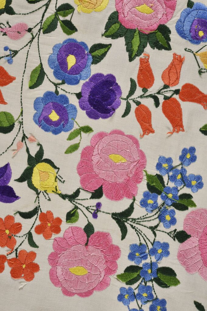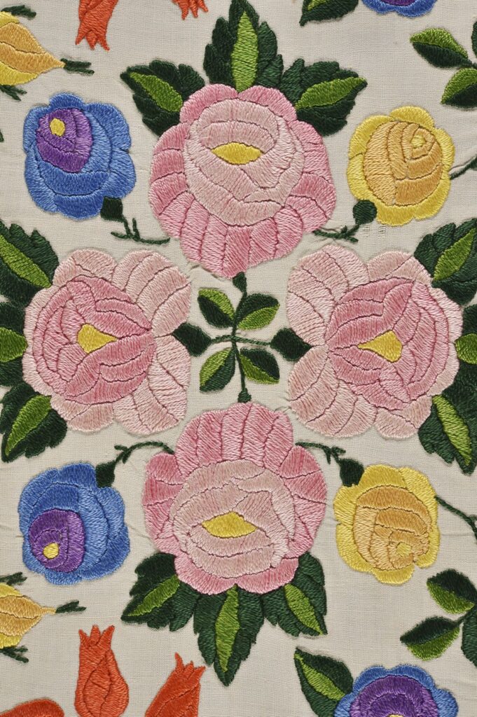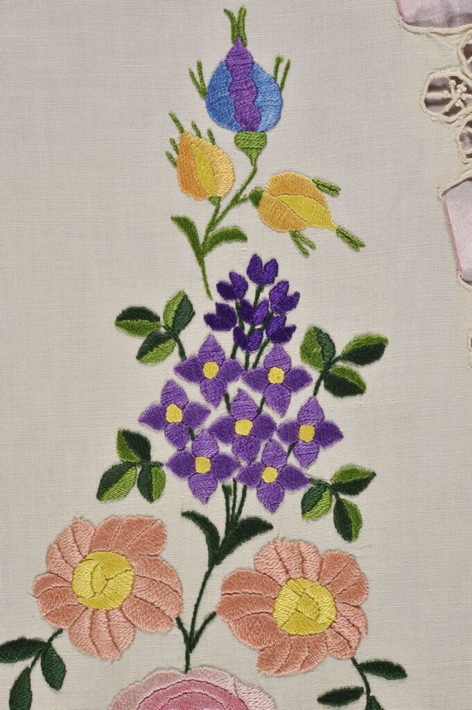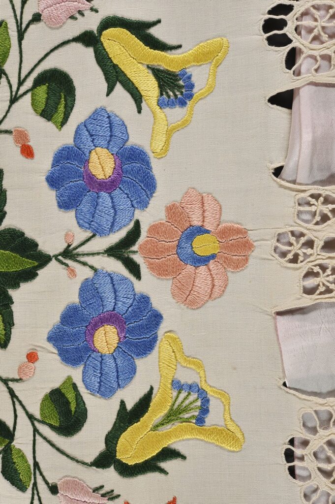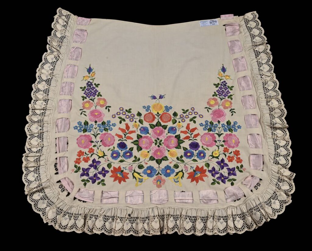 ‘Many hours’ is certainly true of the piece we feature here: an adult’s apron made and decorated somewhere around the end of the 19th and the start of the 20th century. We have several embroidered aprons in the collection, and this one clearly belongs to the ‘fancy’ category. It’s been made – the label suggests in Hungary – using white linen, and is embroidered with a naturalistic floral display worked in bright polychrome silk threads. Stylised floral cutwork motifs run around the edge, with a wide pink ribbon threaded through them. The edge is finished with a wide machine embroidered frill.