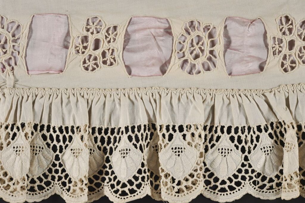 The cutwork is also very neatly executed. It’s possible this was made to be displayed, rather than worn, as there is no sign of staining or direct wear – although, if it were made for ‘best’ than the original owner obviously took good care of it!