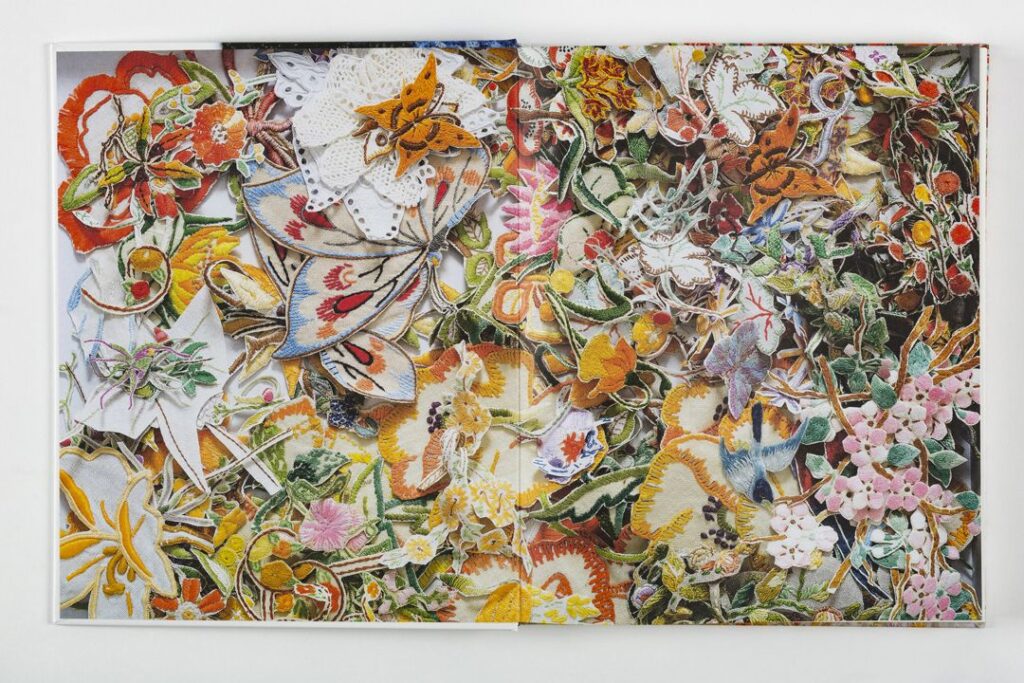 Louise has seen a great evolution in her work over the last 30 years, transitioning from traditional art mediums into reclaiming materials from the home, such a vintage wallpaper, everyday patterned business envelopes and for the past twenty years, discarded and disinherited needlework.  Reclaimed embroidery and lace is used to form two-dimensional relief, sculpture and installation.  After two decades and having published a monograph of her textile works, the evolution is only limited by Louise’s imagination and physical ability.