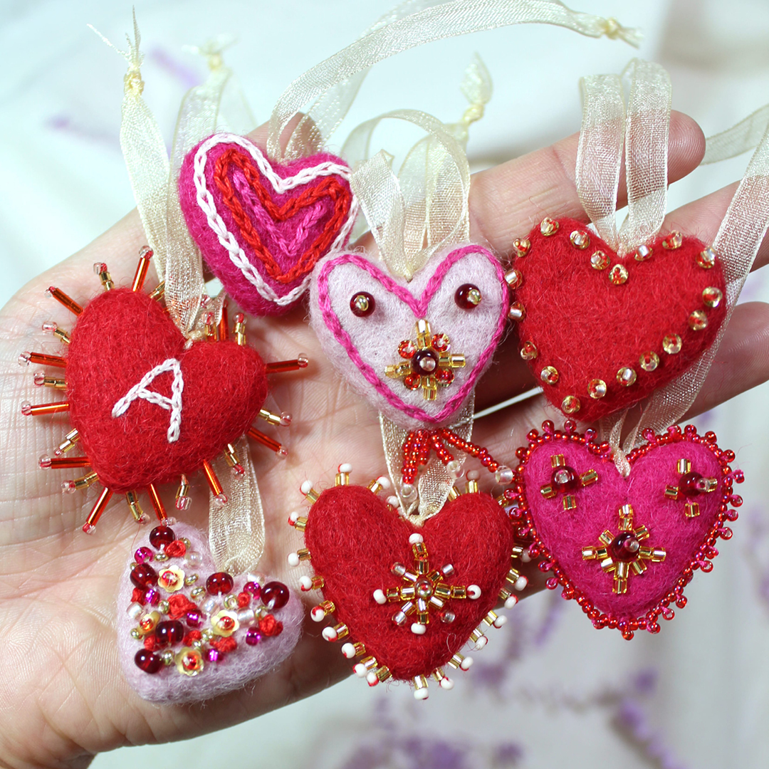 Capture the spirit of Valentine’s Day with adorable felt hearts using various beading techniques by Imogen Melissa