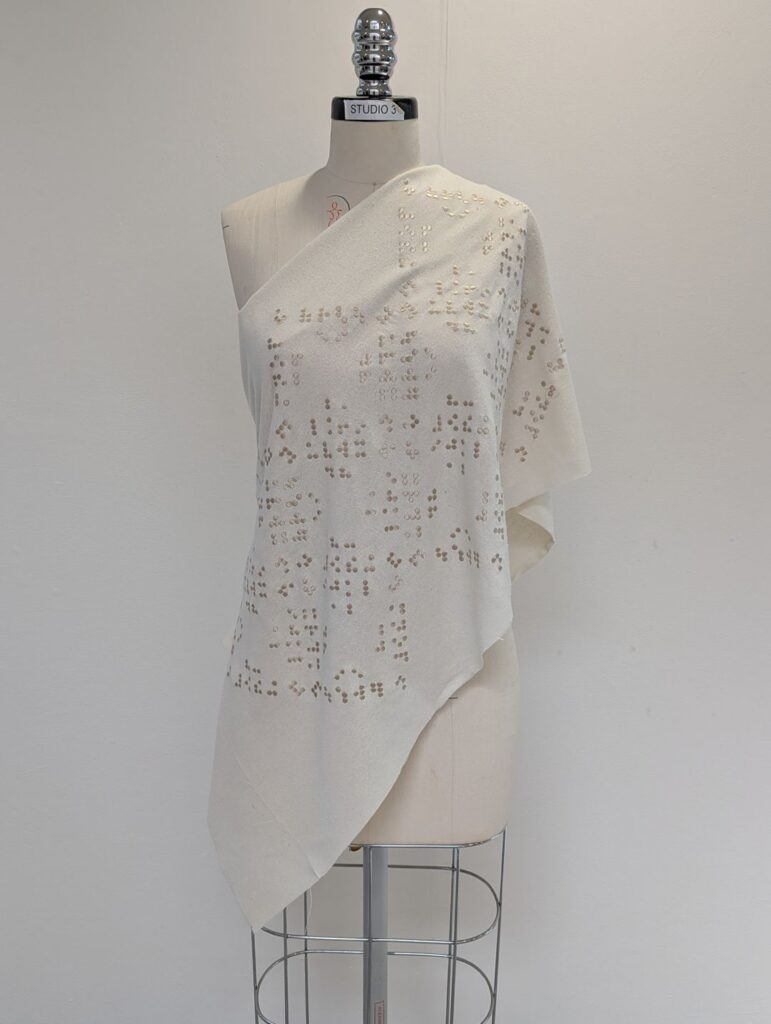 Inspired by Braille, not as ornament but as structure and code, I translate this tactile writing system into woven and embroidered surfaces. Some pieces include readable Braille; others embed private messages in rhythmic, coded formations. Seen from afar, they appear as patterned cloth; on closer engagement, they reveal hidden depth.